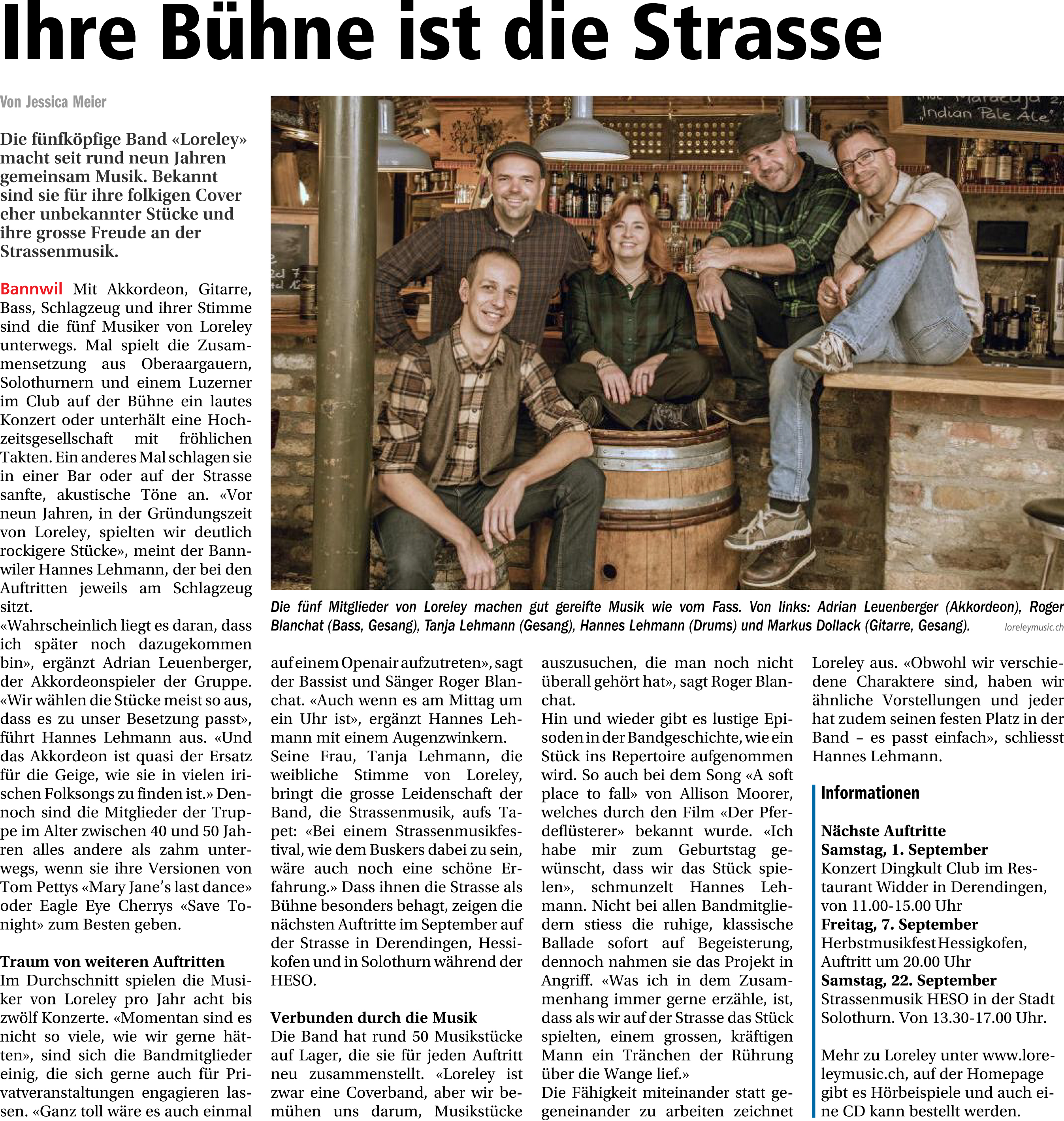 Loreley ist eine 5-köpfige Folk-Rock Band aus dem Raum Langenthal/Solothurn, die ihr Handwerk versteht und von Grund auf gelernt hat. Seit 2009 tourt die Band durch die Schweiz oder in Deutschland und Frankreich. Strassenmusik und Auftritte in Clubs, Bars oder als Pubformation, sind für Loreley genau das Richtige. Die Live-Musik lebt vom typischen Klang des Akkordeons und das Repertoire überzeugt durch seine Vielfältigkeit mit einzigartig arrangierten Songs aus aller Welt und in verschiedenen Sprachen.